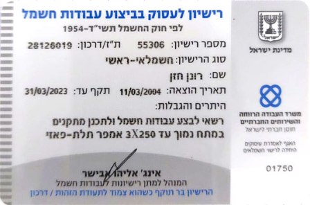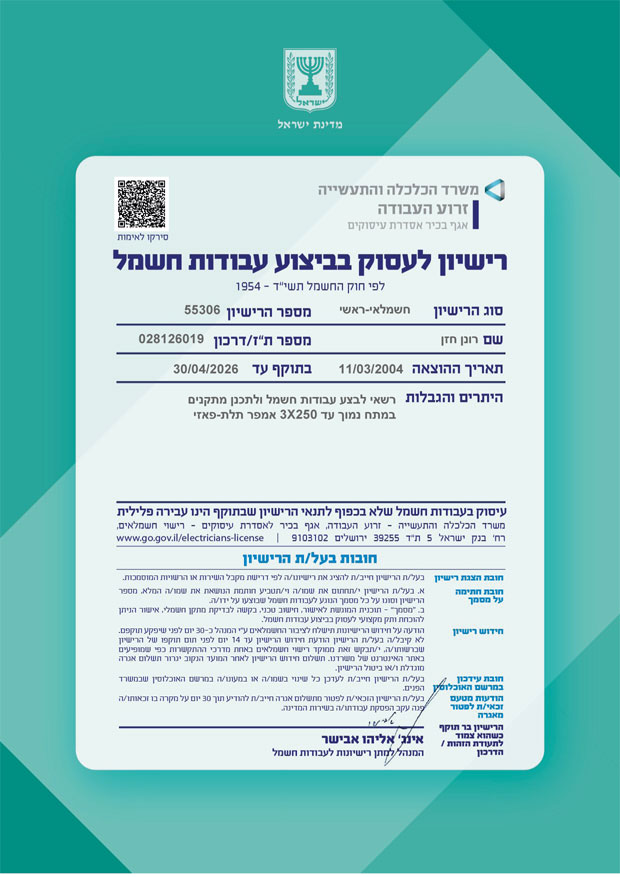 בעל רשיון חשמלאי ראשי מס'